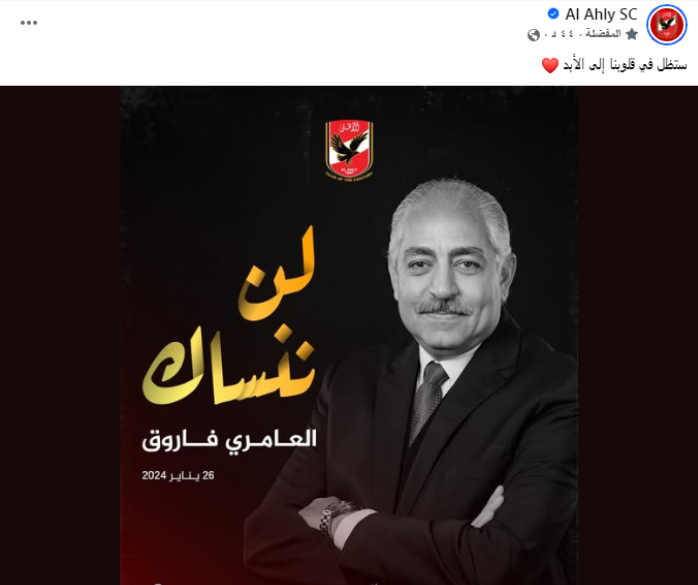 حرص النادي الأهلي اليوم الاثنين 26 يناير على إحياء الذكرى السنوية الثانية لرحيل العامري فاروق، نائب رئيس القلعة الحمراء، الذي وافته المنية في نفس اليوم من عام 2024.