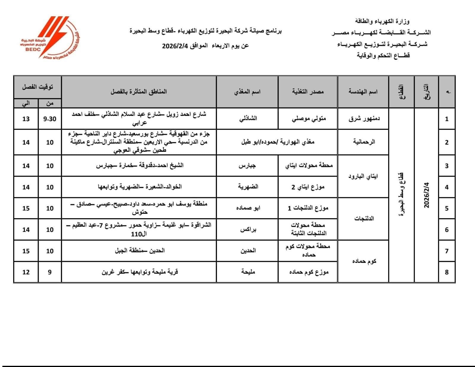 كما أعلنت شركة البحيرة لتوزيع الكهرباء، قطاع وسط البحيرة، فصل التيار الكهربائي عن عدة قرى ومناطق بمراكز دمنهور والرحمانية وإيتاي البارود والدلنجات وكوم حمادة والمحمودية وأبو حمص وادفينا.