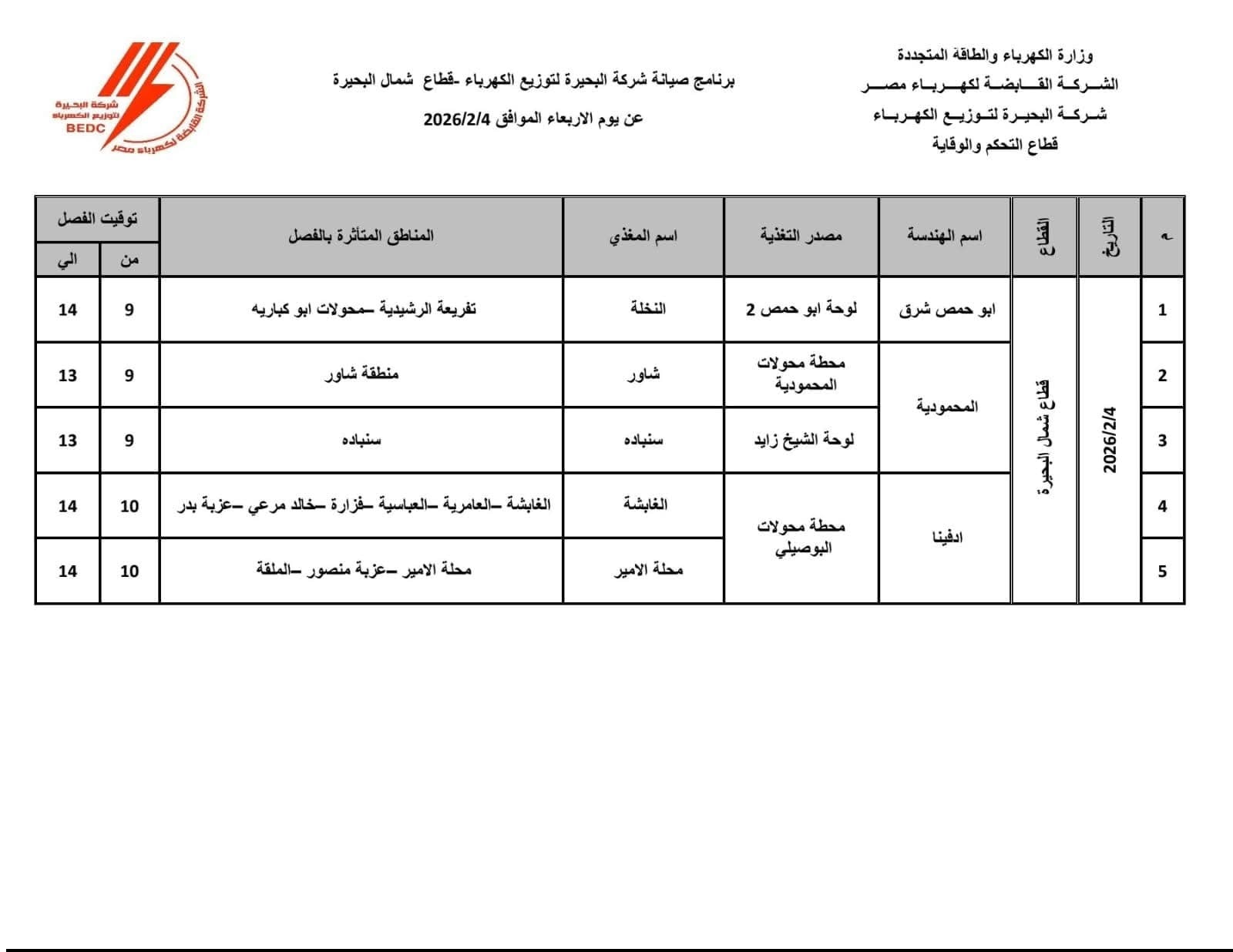 ودعا قطاع كهرباء البحيرة المواطنين والمنشآت الحيوية، خاصة المستشفيات والمرافق الخدمية، إلى اتخاذ التدابير اللازمة خلال فترة الفصل المقررة، مشيرًا إلى أن أعمال الصيانة تأتي في إطار خطة رفع كفاءة الشبكة الكهربائية وضمان استقرار التغذية خلال الفترة المقبلة.