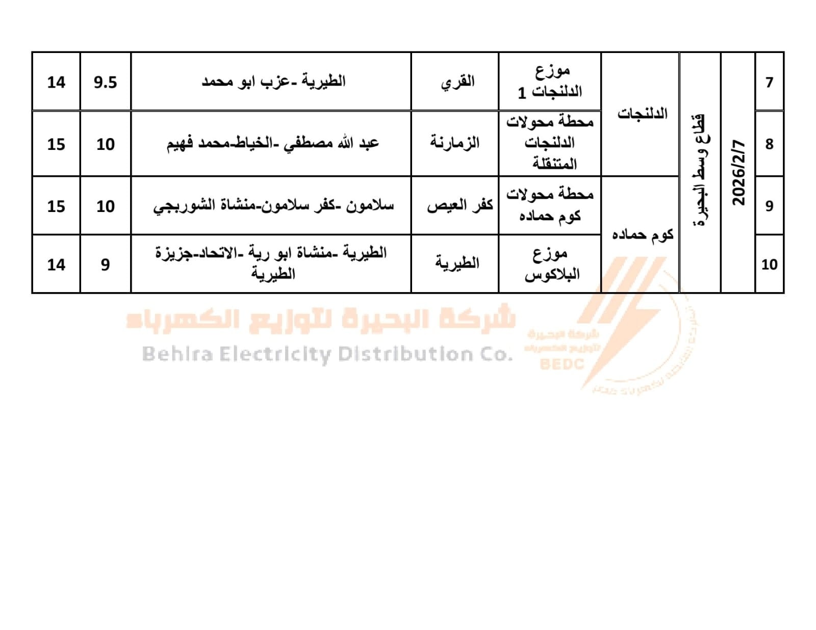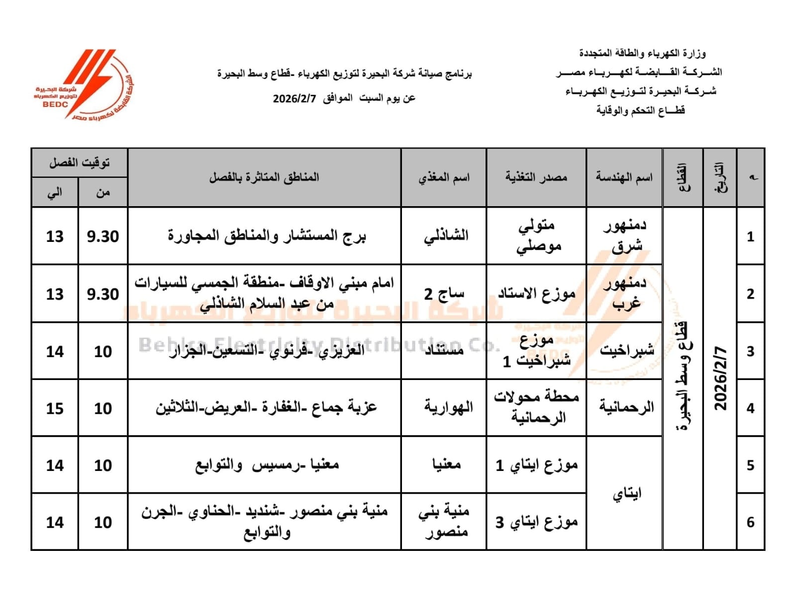 كما أعلنت شركة البحيرة لتوزيع الكهرباء، قطاع وسط البحيرة، فصل التيار الكهربائي اليوم السبت، عن عدة قرى ومراكز دمنهور والرحمانية وإيتاي البارود وشبراخيت والدلنجات وكوم حمادة والمحمودية وادفينا.