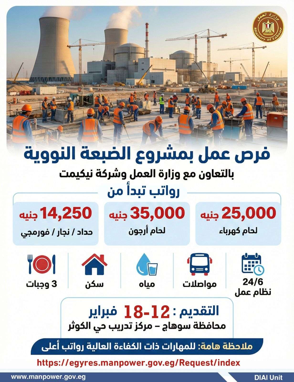 وزارة العمل تفتح باب التقديم لوظائف فنية بمشروع الضبعة النووية في سوهاج برواتب تصل إلى 35 ألف جنيه