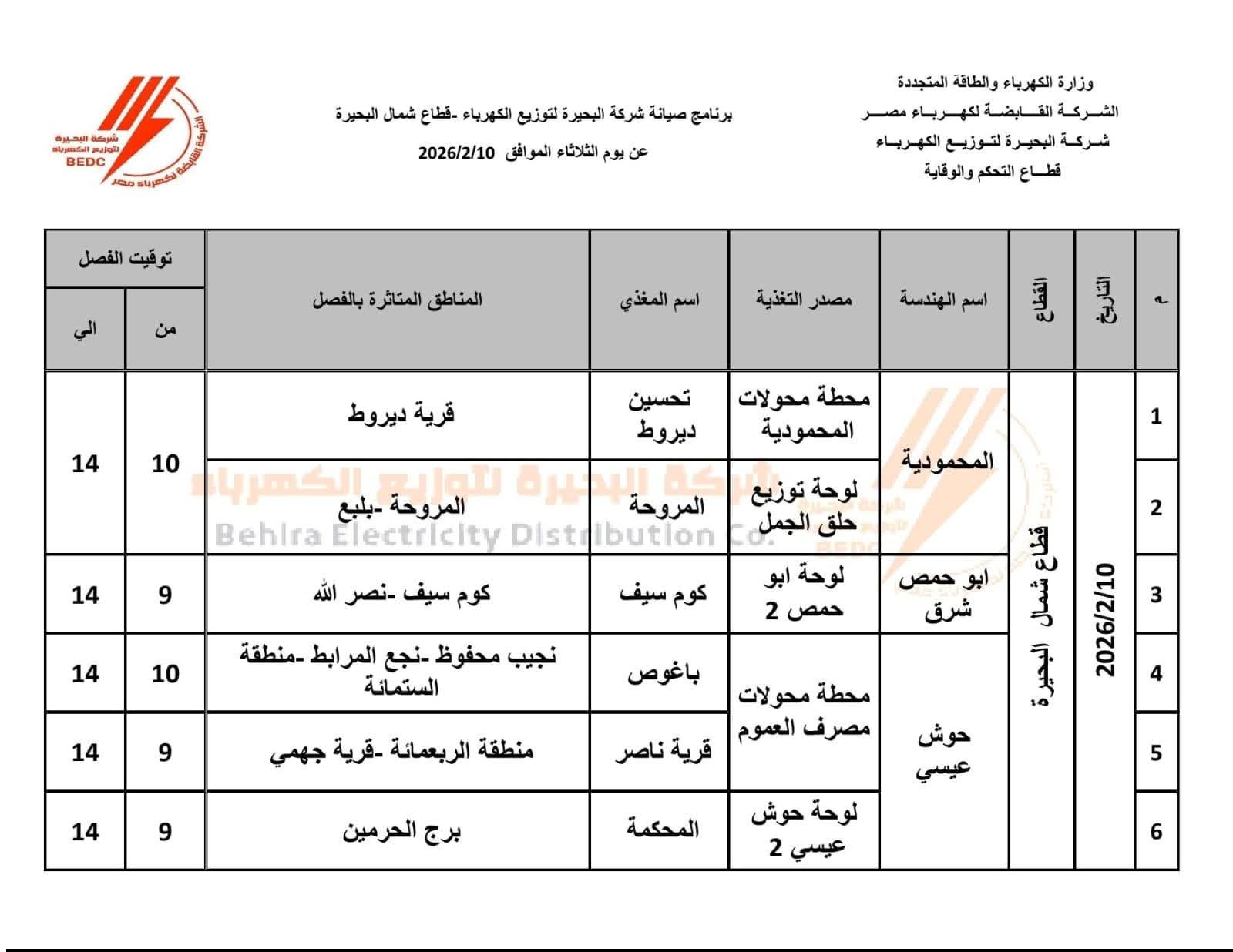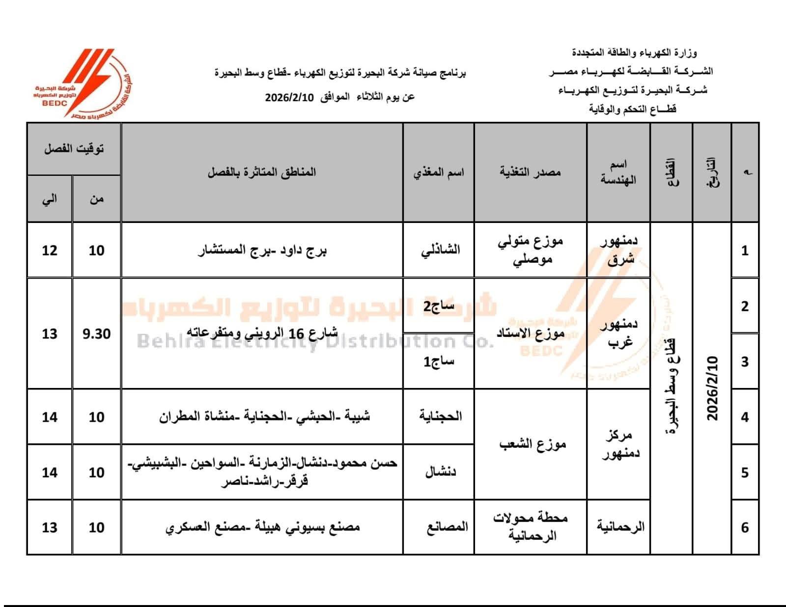 وتهيب شركة البحيرة لتوزيع الكهرباء المواطنين القاطنين في المناطق المذكورة، وكافة المنشآت الخدمية "المستشفيات، المخابز، ومحطات مياه الشرب"، اتخاذ التدابير اللازمة وتدبير احتياجاتهم خلال فترة انقطاع التيار.