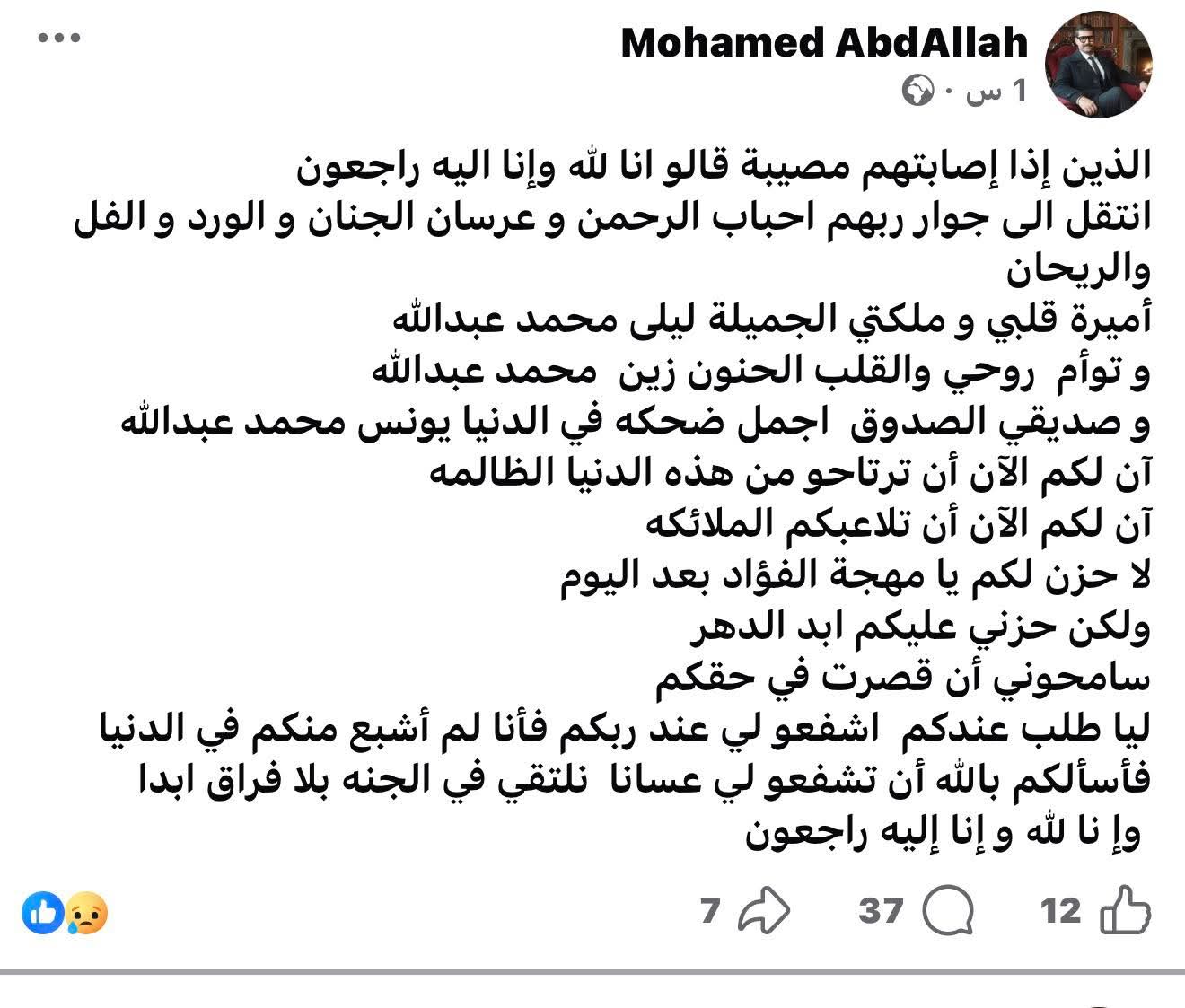 وكتب والدهم محمد عبد الله، نعيًا مؤثرًا عبر صفحته الشخصية، يودع فيه فلذات كبده بكلمات مليئة بالحزن والأسى.