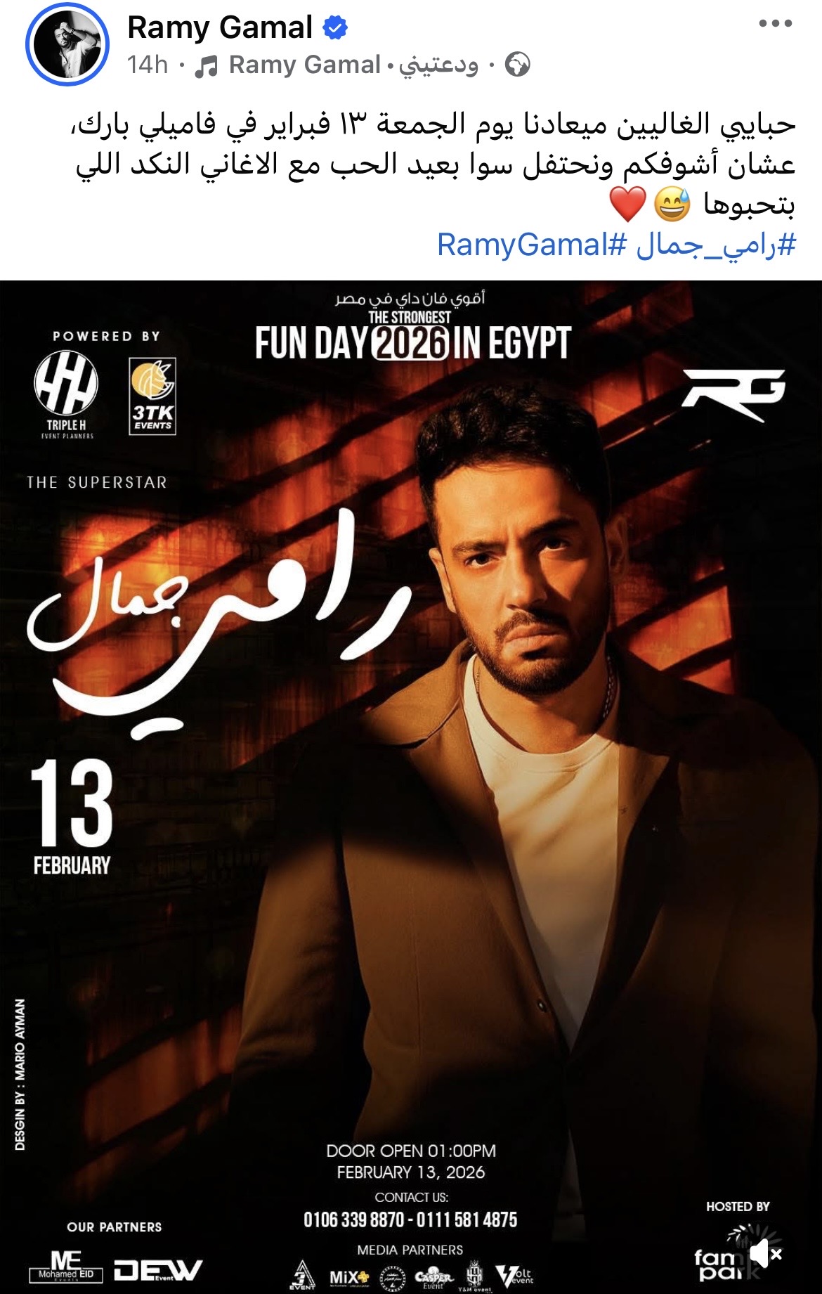 كشف الفنان رامي جمال عن تفاصيل حفله الغنائي المقبل، احتفالًا بعيد الحب، حيث يستعد للقاء جمهوره في حفل مميز يُقام داخل فاميلي بارك، في سهرة ينتظر أن تجمع بين الأجواء الرومانسية واللحظات الغنائية القريبة من القلب.