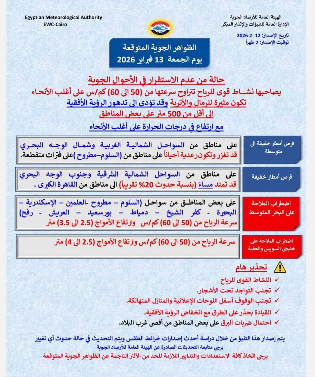 حذرت الهيئة العامة للأرصاد الجوية، من حالة عدم الاستقرار في الأحوال الجوية اليوم الجمعة 13 فبراير 2026، تزامنًا مع نشاط رياح قوية تسمى «زعابيب أمشير»، ما دفع الهيئة لإصدار تحذيرات مهمة للمواطنين، خاصة من الوقوف تحت الأشجار أو اللوحات الإعلانية بسبب شدة الرياح.
