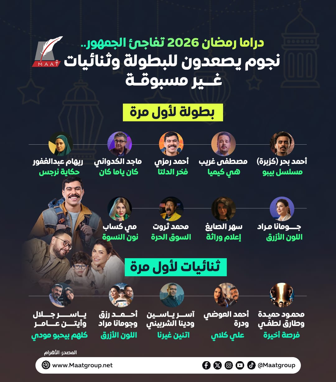 يشهد ماراثون دراما رمضان لعام 2026 تحولاً جذرياً في موازين القوى الفنية، حيث أعلنت شركات الإنتاج عن رهانها الكبير على "الوجوه الشابة" والنجوم الذين ظلوا لسنوات في منطقة الأدوار الثانية، ليتصدروا المشهد هذا العام ببطولات مطلقة لأول مرة، كما يبرز الموسم بظهور ثنائيات فنية تجتمع معاً لأول مرة حسب ماعت جروب، مما يضفي حالة من التجدد والترقب لدى الجمهور العربي.