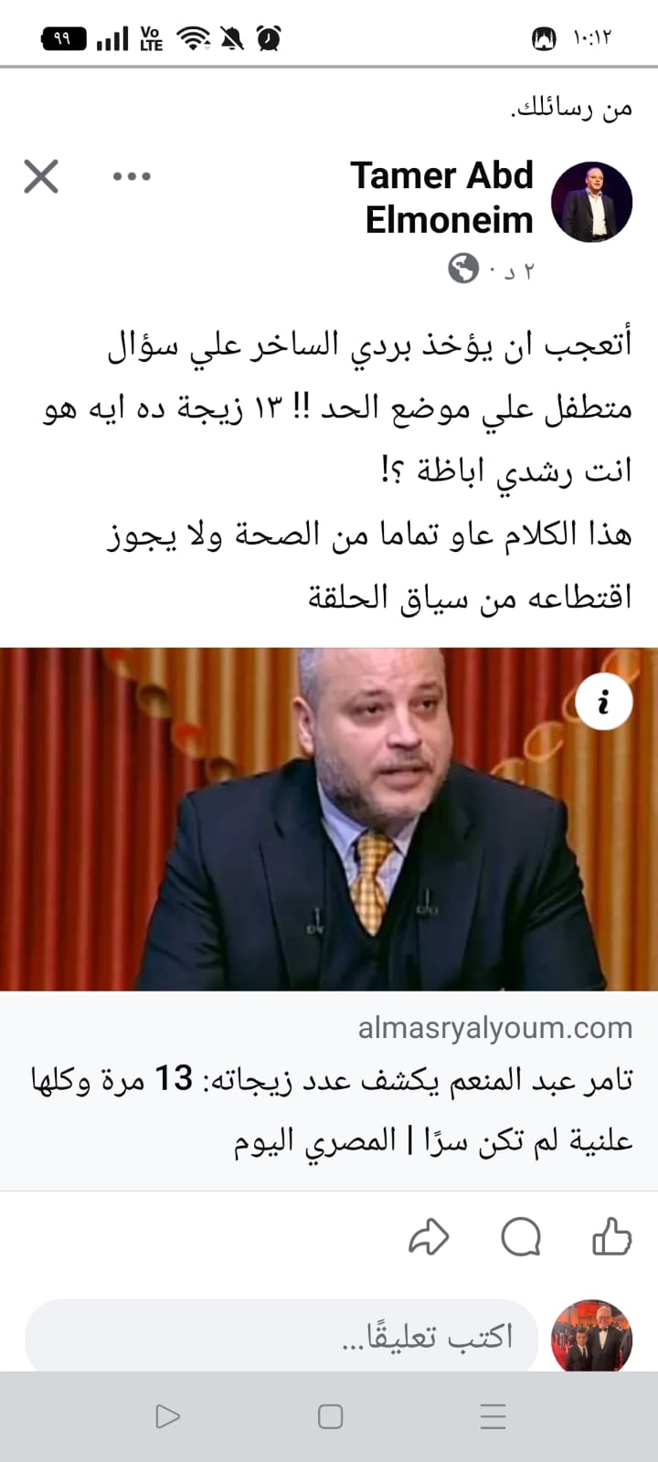 وكتب الفنان تامر عبدالمنعم منشورا عبر صفحته الرسمية على موقع التواصل الإجتماعي فيسبوك تعليقا على هذا الموضوع وقال : أتعجب أن يؤخذ بردي الساخر على سؤال متطفل على موضع الحد !! ١٣ زيجة ده ايه هو انت رشدي اباظة ؟!