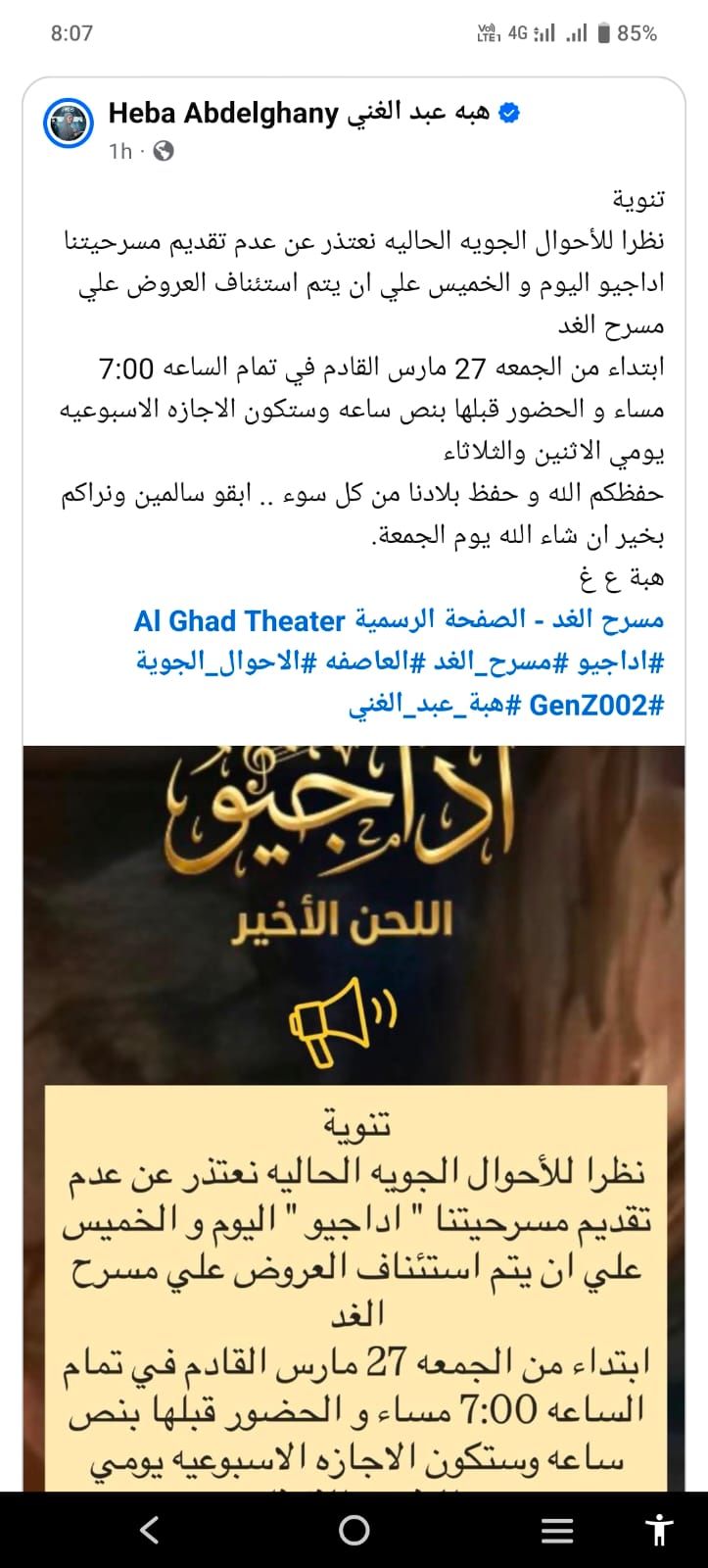وكانت نشرت الفنانة هبة عبد الغني مجموعة من الصور الخاصة بالعرض المسرحي “أداجيو .. اللحن الأخير” ، وذلك عبر صفحتها الرسمية بمواقع التواصل الاجتماعي وكتبت عليها : “أول ليلة عرض كامل العدد قبل العرض بساعة ونص . نصيحة الأيام اللي جايه احجزو أماكنكم قبل العرض بوقت كفاية.”