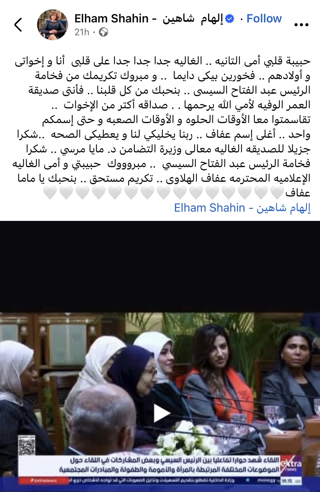 ونشرت إلهام شاهين رسالة مؤثرة عبر حسابها الرسمي على موقع "فيسبوك"، عبّرت فيها عن عمق العلاقة التي تجمعها بالإعلامية الكبيرة، ووصفتها بأنها "أم ثانية" لها ولأسرتها، مشيرة إلى مكانتها الخاصة في حياتهم، ليس فقط كصديقة لوالدتها الراحلة، بل كجزء أصيل من العائلة.