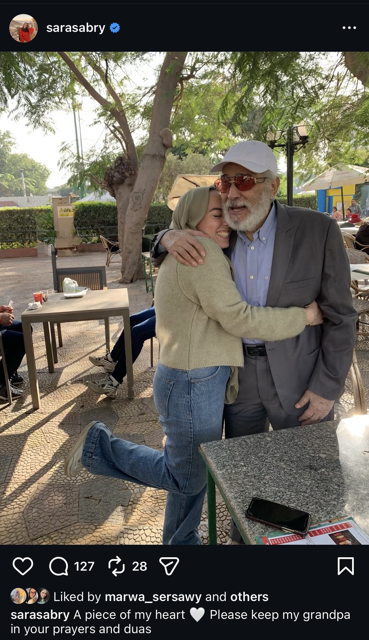 وفي هذا السياق، حرصت حفيدته سارة صبري على توجيه رسالة مؤثرة عبر حسابها على موقع “إنستجرام”، حيث نشرت صورة تجمعها بجدها، وعلّقت قائلة: “قطعة من قلبي.. أرجوكم ادعوا لجدي”، في لفتة إنسانية عبّرت عن مدى تعلقها به، ودفعت الكثير من المتابعين إلى التفاعل بالدعاء له بالشفاء العاجل.
