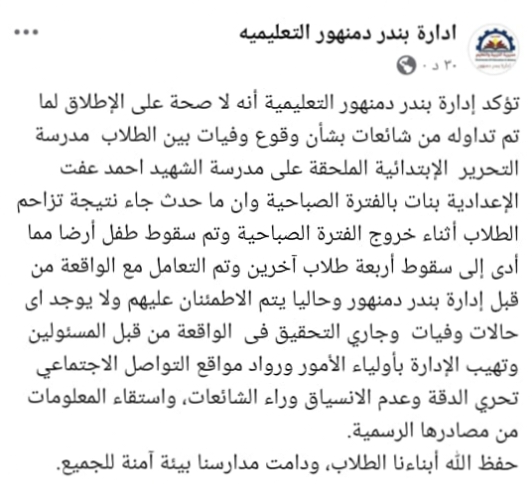قطعت مديرية التربية والتعليم بمحافظة البحيرة، ممثلة في إدارة بندر دمنهور التعليمية، الطريق أمام الشائعات التي اجتاحت منصات التواصل الاجتماعي خلال الساعات الماضية، والتي زعمت وقوع وفيات بين تلاميذ مدرسة التحرير الابتدائية (الملحقة بمدرسة الشهيد أحمد عفت الإعدادية بنات).