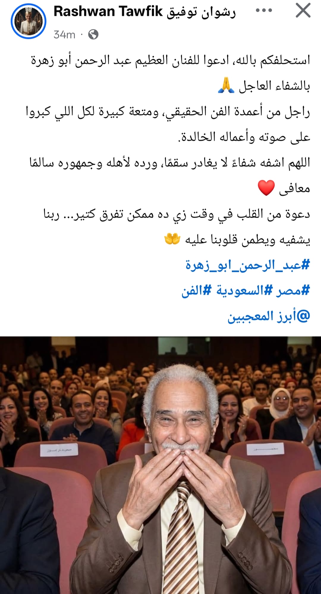 وكتب رشوان توفيق عبر حسابه على موقع “فيسبوك” رسالة مؤثرة، ناشد فيها الجميع الدعاء لأبو زهرة، قائلًا: “استحلفكم بالله، ادعوا للفنان العظيم عبد الرحمن أبو زهرة بالشفاء العاجل.. راجل من أعمدة الفن الحقيقي، ومتعة كبيرة لكل اللي كبروا على صوته وأعماله الخالدة”.