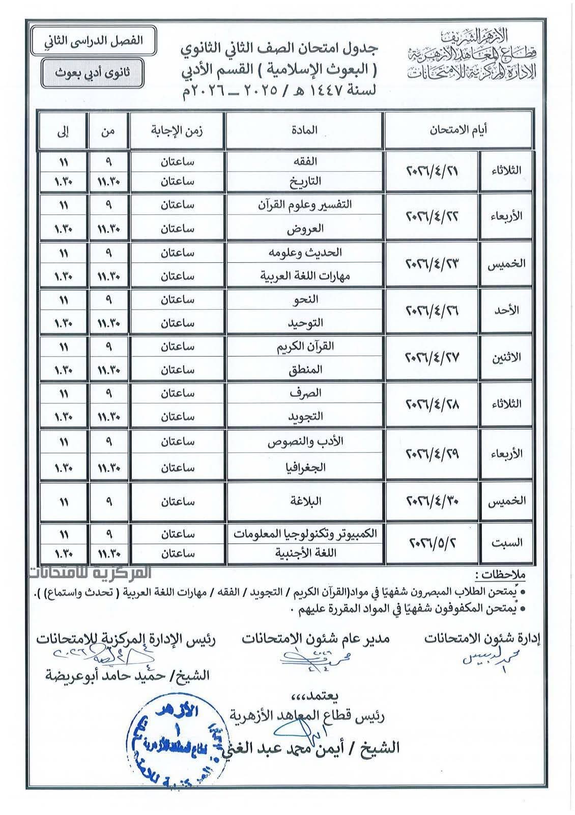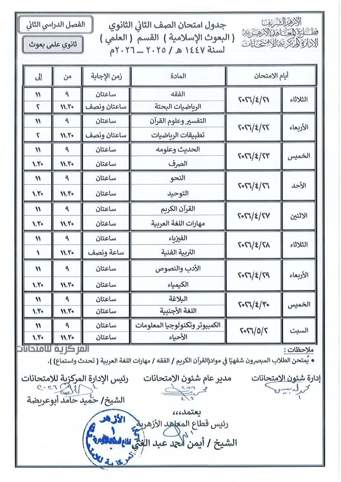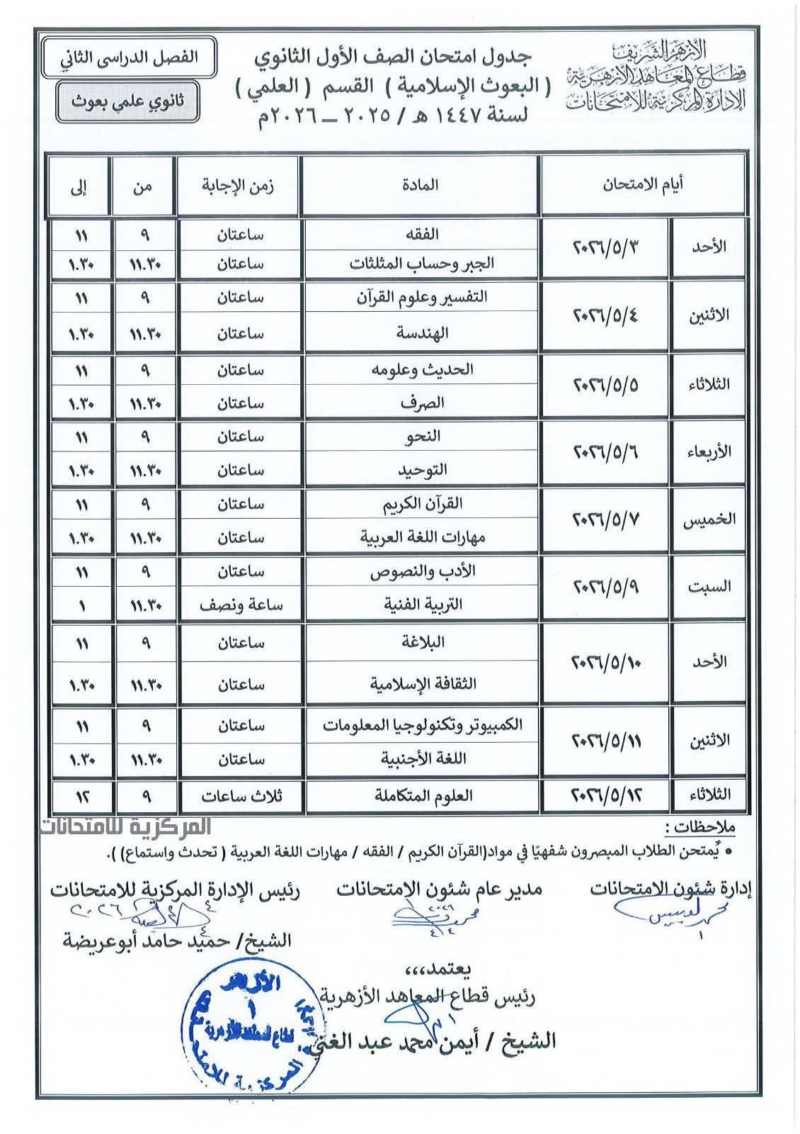 جدول امتحانات المعاهد الأزهرية