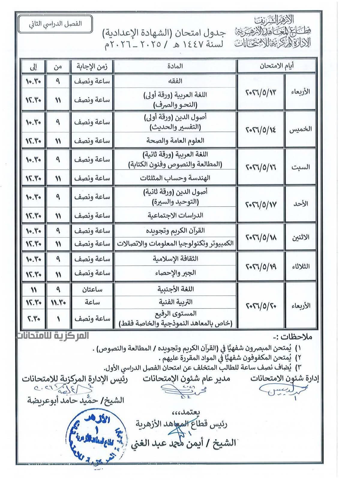 أكد الشيخ أيمن عبد الغني، رئيس قطاع المعاهد الأزهرية، أن الجداول هذا العام وضعت بعناية فائقة، مشيراً إلى أنه: «تمت مراعاة وجود فواصل زمنية كافية (أيام راحة) بين المواد الدراسية، وذلك استجابةً لرغبات أبنائنا الطلاب والسادة أولياء الأمور، لضمان إعطاء الفرصة كاملة للمراجعة وتحقيق أفضل النتائج».