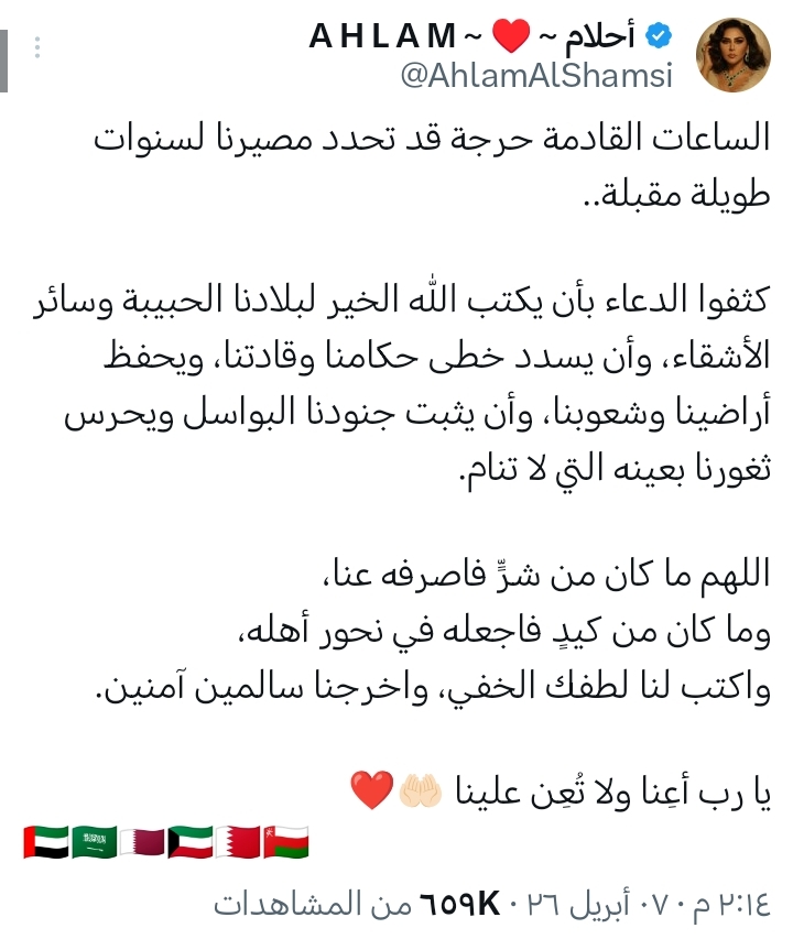 دعت الفنانة الإماراتية أحلام الشامسي جمهورها ومتابعيها إلى الإكثار من الدعاء خلال الساعات الماضية، في ظل حالة التوتر التي تشهدها المنطقة، وما يُثار حول احتمالات تصاعد الأوضاع بين قوى دولية، الأمر الذي أثار قلقًا واسعًا بين الشعوب، خاصة في الدول العربية ومنطقة الخليج.