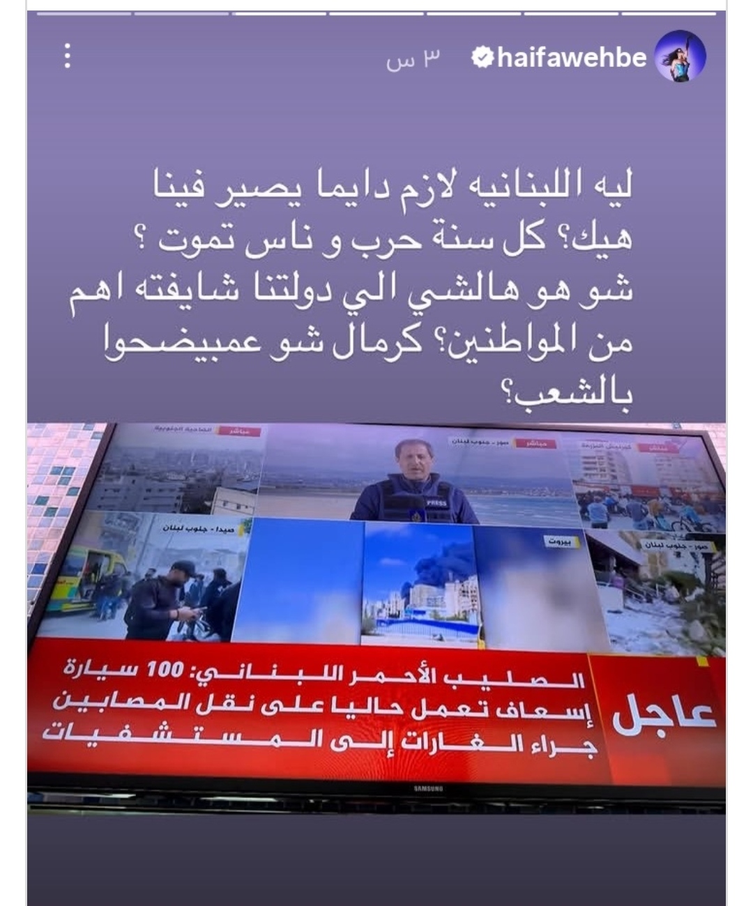 أعربت الفنانة هيفاء وهبي عن حزنها العميق واستيائها من الأوضاع المتوترة في لبنان، وذلك عبر خاصية «ستوري» على حسابها الرسمي بموقع «إنستجرام»، حيث عبّرت بكلمات مؤثرة عن قلقها إزاء ما تشهده البلاد من أزمات متكررة. وتساءلت بمرارة عن أسباب استمرار الحروب وسقوط الضحايا، معتبرة أن ما يحدث يفوق قدرة المواطنين على الاحتمال، ويطرح علامات استفهام حول أولويات الدولة في ظل هذه الظروف الصعبة.
