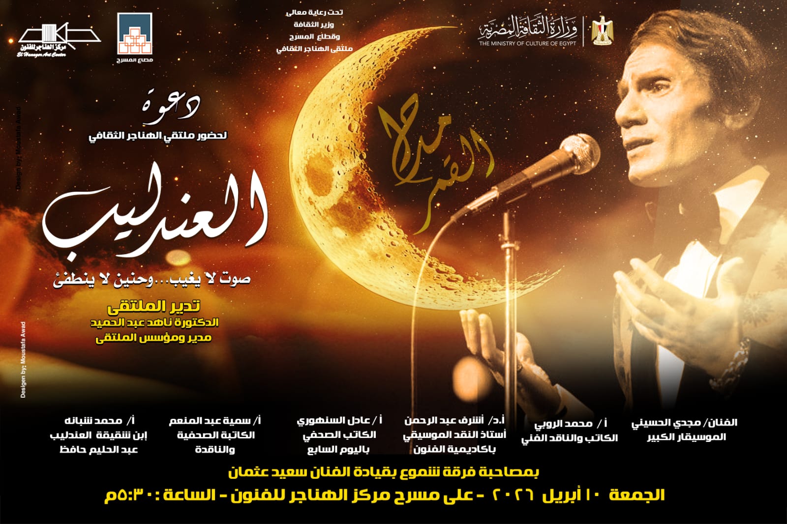 ويأتي هذا الملتقى في إطار الاهتمام بإحياء رموز الغناء العربي وتوثيق أثرهم الفني والإنساني، حيث يسلط الضوء على المسيرة الاستثنائية للعندليب الأسمر عبد الحليم حافظ، بوصفه أحد أبرز رموز الغناء العربي في القرن العشرين، وصاحب بصمة فنية لا تزال حاضرة في وجدان الجمهور حتى اليوم.