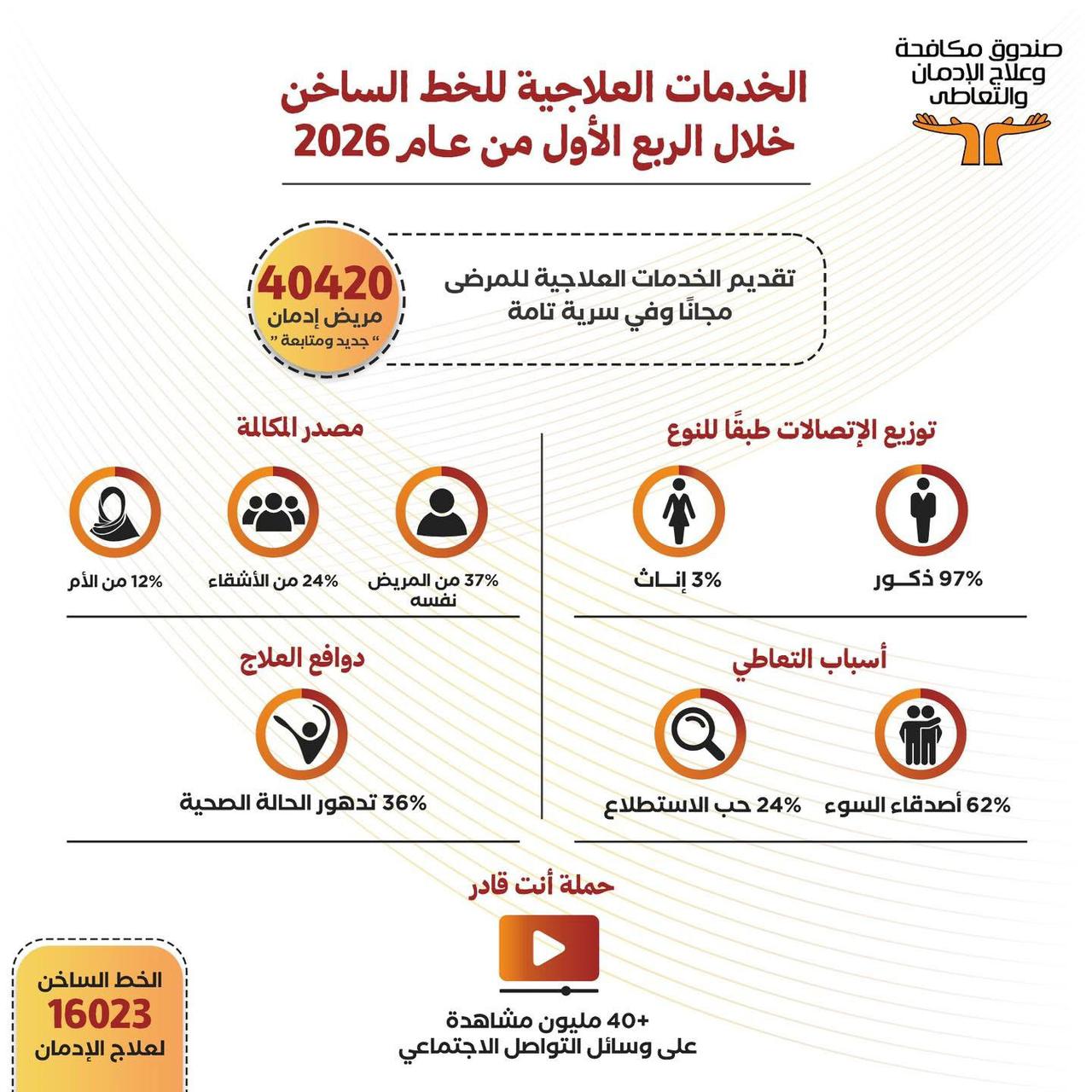 نشر صندوق مكافحة وعلاج الإدمان والتعاطي انفوجراف على الصفحة الرسمية للصندوق "الفيس بوك" عن مجهودات الخط الساخن للصندوق "16023"، خلال الربع الأول من عام 2026، حيث تم تقديم الخدمات العلاجية لعدد 40420 مريض "جديد ومتابعة"، كما يتم توفير الخدمات العلاجية لأى مريض إدمان من أبناء المناطق المطورة "بديلة العشوائيات" "الأسمرات، المحروسة، روضة السودان، روضة السيدة، أهالينا، الخيالة، بشاير الخير، حدائق أكتوبر"، وتنوعت الخدمات ما بين مكالمات للمتابعة والمشورة والعلاج والتأهيل والدمج المجتمعي، حيث إن الخدمات العلاجية تقدم للمرضى مجاناً ووفقا للمعايير الدولية، وبلغت نسبة المستفيدين الذكور من هذه الخدمات 97 % بينما بلغت نسبة الإناث 3%، حيث تردد المرضى على المراكز العلاجية التابعة للصندوق والشريكة مع الخط الساخن وعددها 35 مركز بـ 20 محافظة حتى الآن.