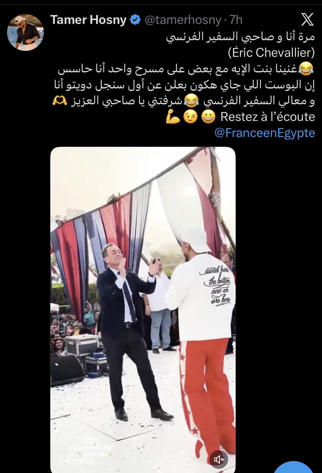 وأضاف الفنان الشهير بأسلوبه المرح، مازحًا متابعيه قائلاً إنه يتوقع أن يكون منشوره القادم إعلانًا عن “أول دويتو غنائي” يجمعه بالسفير الفرنسي، في إشارة ساخرة إلى الأجواء الودية التي جمعت بينهما على المسرح، والتي بدت أقرب إلى الصداقة أكثر من كونها لقاءً رسميًا.