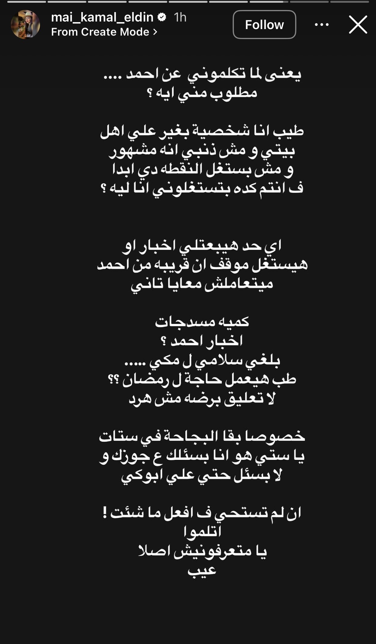وأوضحت مي كمال الدين أنها فوجئت بتكرار أسئلة المتابعين حول أخبار أحمد مكي، أو مطالبتها بنقل رسائل له، وهو ما اعتبرته تجاوزًا غير مقبول للحدود الشخصية، مؤكدة أنها لا ترى أي مبرر لاستمرار هذا النوع من التفاعل، خاصة أنه يضعها في مواقف لا ترغب في التواجد بها.